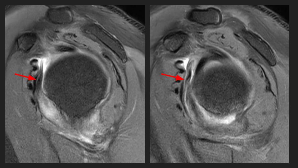 There is marked capsular thickening and edema, most pronounced in the axillary capsule; this is adhesive capsulitis.There is diffuse thickening of the MGHL.
